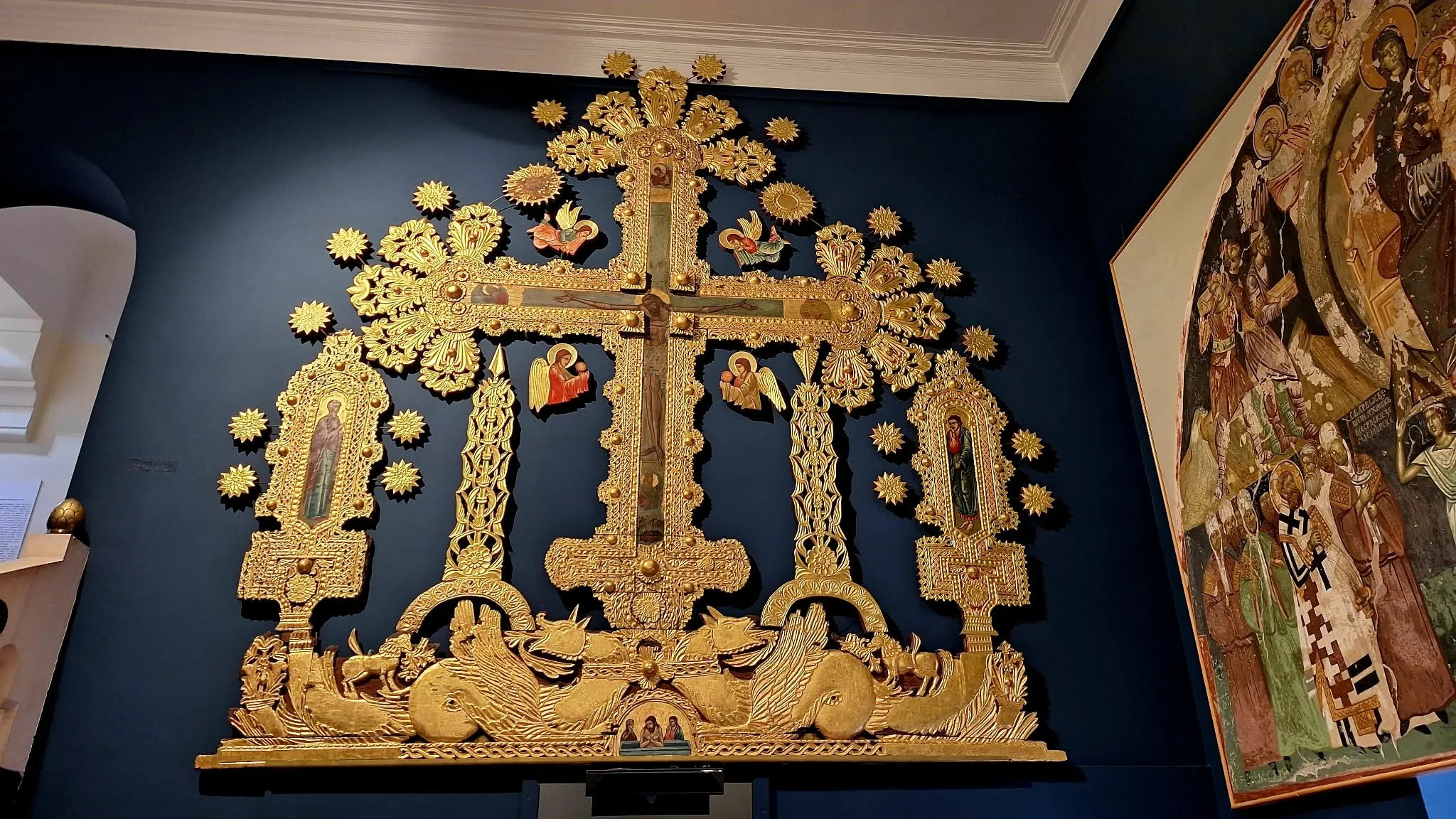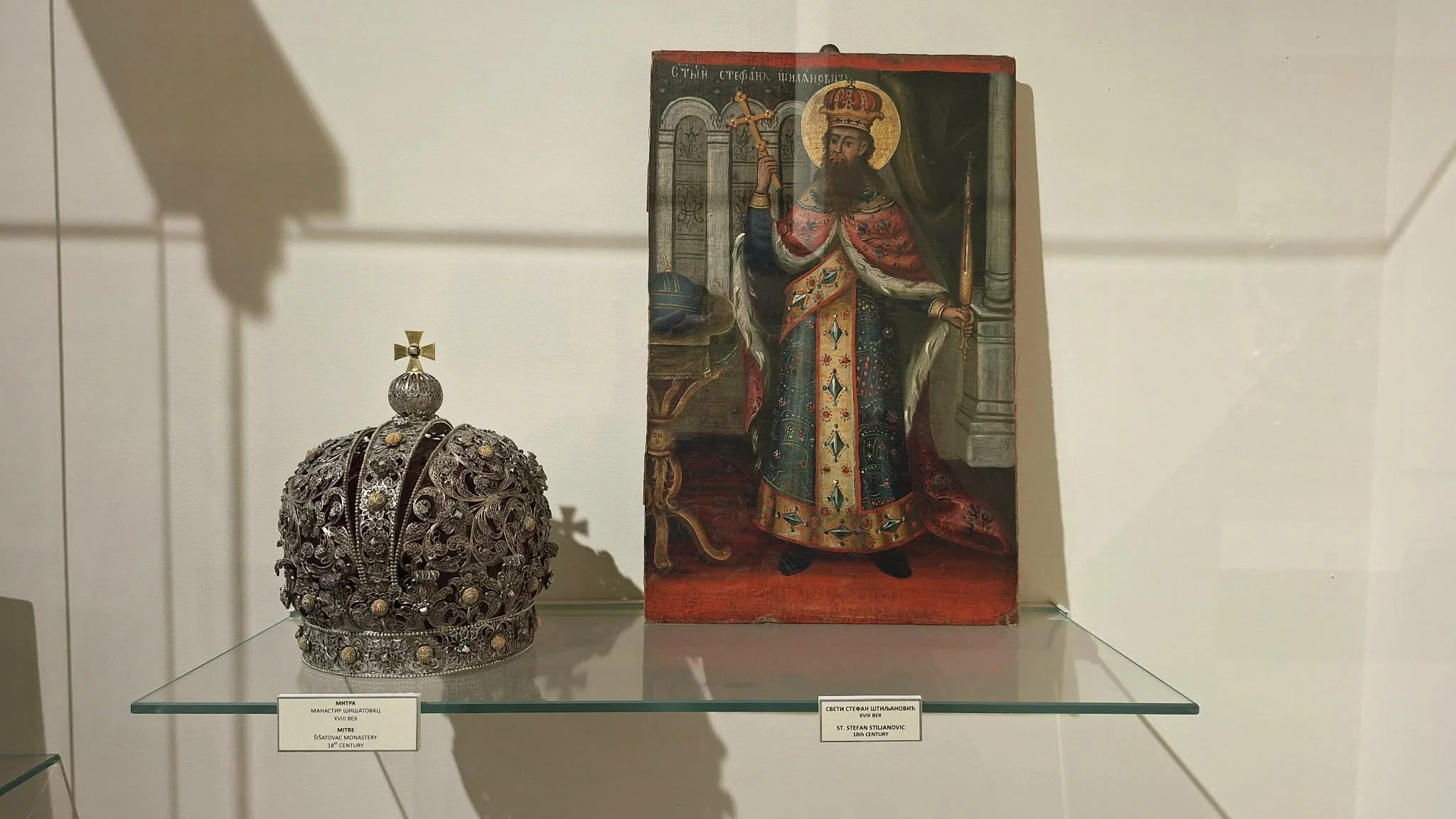 Među najsjajnijim eksponatima koji su utočište pronašli daleko od fruškogorskih svetinja su: monumentalni Krst sa Raspećem iz ikonostasa Velike Remete, kruna sa moštiju Svetog Stefana Štiljanovića iz Šišatovca, epitrahilj iz Krušedola, medaljon sa likom Isusa čuvan na moštima Svetog Teodora Tirona u Novom Hopovu, kao i čitav niz jedinstvenih predmeta koji ne potiču originalno iz fruškogorskih manastira, ali su se tamo čuvali sve do Drugog svetskog rata poput plaštanice kralja Milutina, svečane odore kneza Lazara, kao i nadaleko poznate Jefimijine Pohvale knezu Lazaru, koja se čuvala u manastiru Vrdnik.
